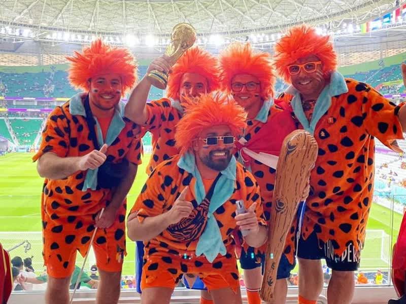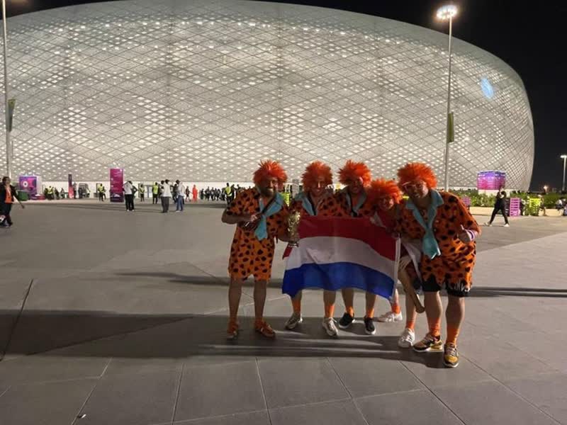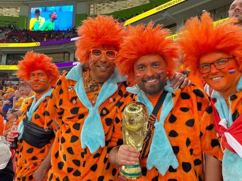 Dorian Acoca en Ezra Bras uit Dordrecht reisden zondag met een paar Dordtse vrienden naar Qatar. Ze waren maandag bij de wedstrijd Nederland-Senegal. Het gezelschap ziet er zo vrolijk en kleurrijk uit in hun oranje Flintstone-pakken, dat ze vaak op tv in beeld zijn èn dat Qatari en supporters uit andere landen in de rij staan om met de oranje vrienden op de foto gaan.