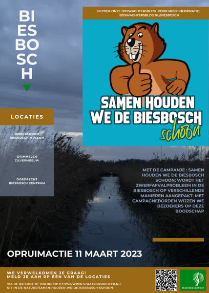 Wil je zelf de handen uit de mouwen steken en meehelpen met het opruimen van de Biesbosch? Op zaterdag 11 maart organiseert Staatsbosbeheer met verschillende partijen een schoonmaakactie. Vanuit drie verschillende toegangspoorten (Drimmelen, Dordrecht en Werkendam) worden acties gestart. De opruimacties starten om 09.30 uur en eindigen rond 13.30 uur met een lunch. Materialen om het afval op te ruimen zijn aanwezig. Om alles goed te laten verlopen, is het aantal deelnemers per locatie beperkt. Aanmelden is daarom verplicht en kan via