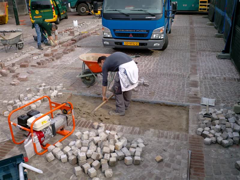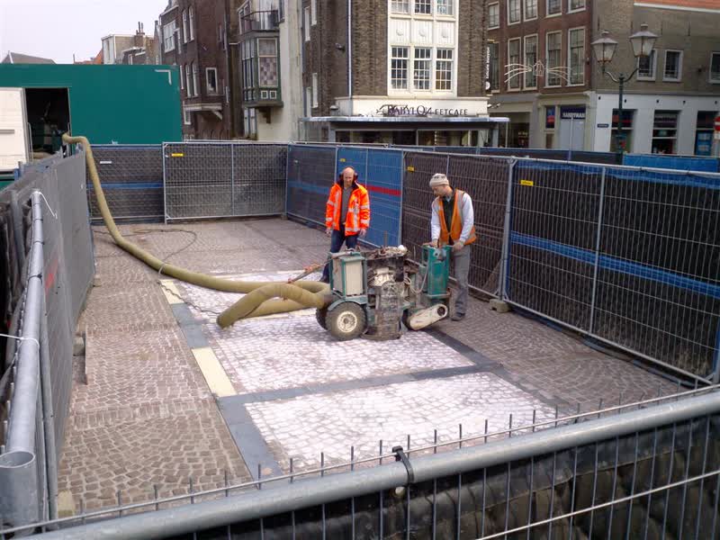 De keien op het plein worden gefreesd, geslepen en gewaterstraald. Dat moet het oppervlak gelijkmatiger maken. De keien liggen ongelijk. In het weekend wordt het deel waar de werkzaamheden plaatsvinden tijdelijk vrijgegeven voor de opbouw van terrassen.