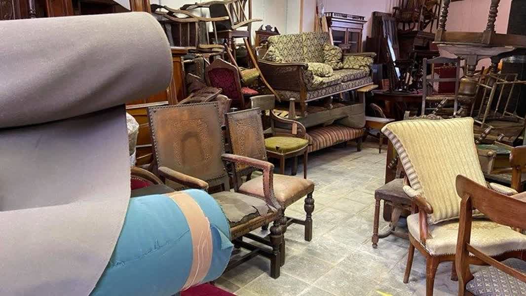 Er werkte dus een stoffeerder en handelaar in oude meubels. Het huis staat dan ook behoorlijk vol met rollen stof en spulletjes als banken en stoelen. "We zijn al maanden bezig om alles van zolder naar beneden te halen. De koper kan het erbij nemen als hij wil. Maar dan moet hij wel snel zijn. Ik probeer het nu los te verkopen, want het is zonde om weg te gooien. Dit is de ziel en zaligheid van mijn vader."