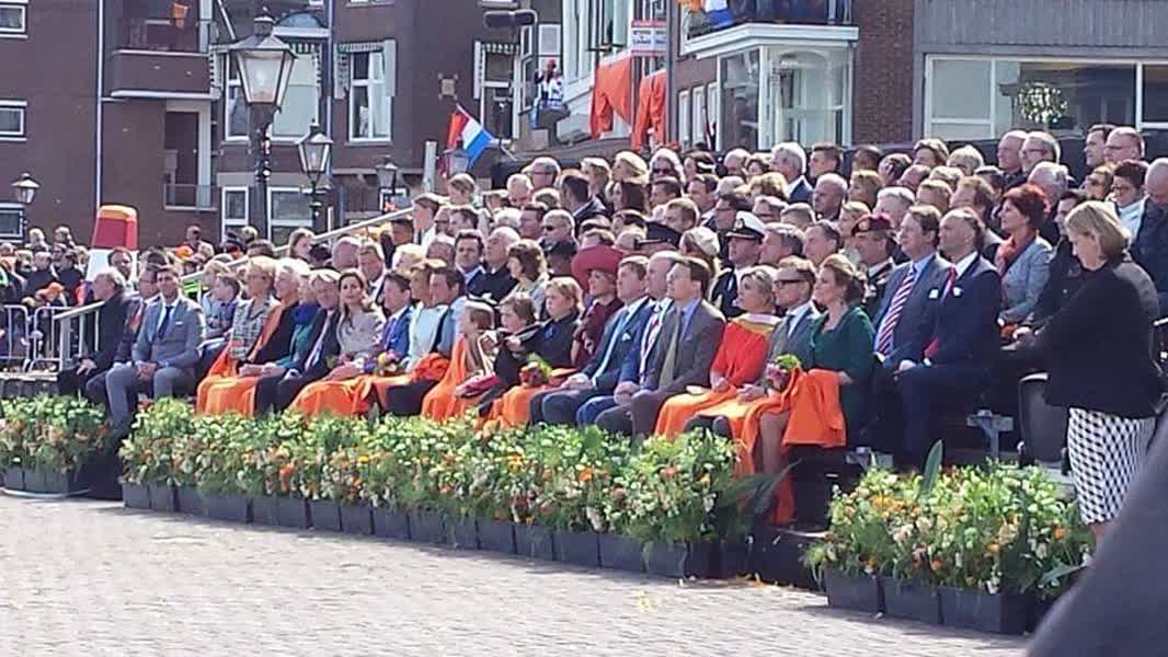 Het koningspaar volgt de grande parade vanaf de tribune op het Groothoofd