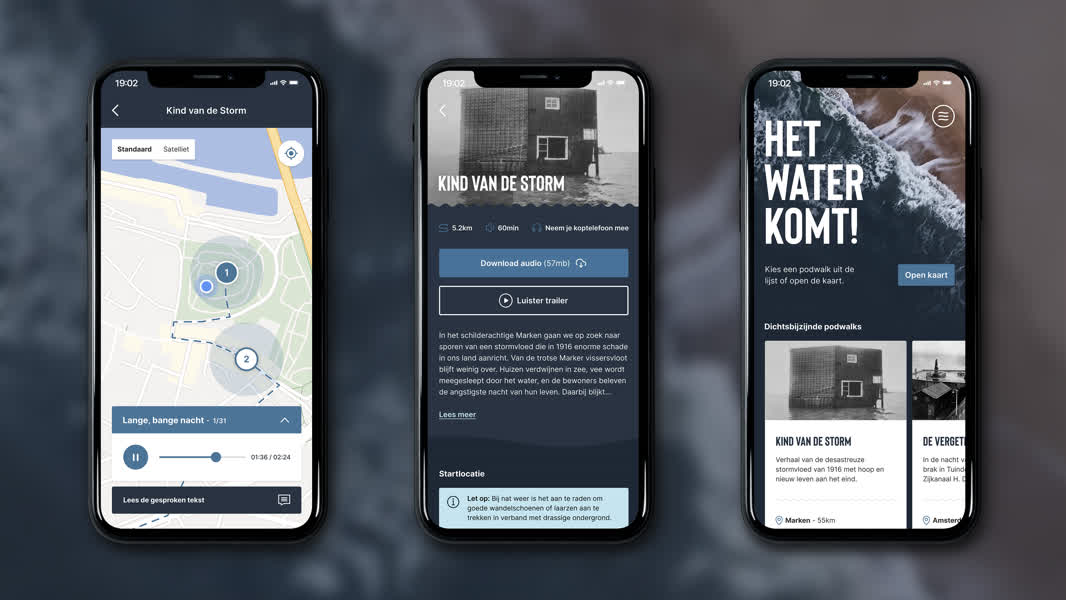 Over deze rampzalige overstroming hoort de luisteraar dus alles in de podwalk van Het Water Komt. In de podwalk, die naast Dordrecht ook te bewandelen is in steden als Amsterdam, Nijmegen en Zwolle, wandelt de luisteraar met een koptelefoon op een vooraf bepaalde route. De Dordtse route is ongeveer 4.5 kilometer lang en kent 33 audiofragmenten. De start en eindlocatie van de route is het Centraal station, waarna de wandeling de luisteraar door de Dordtse binnenstad voert.