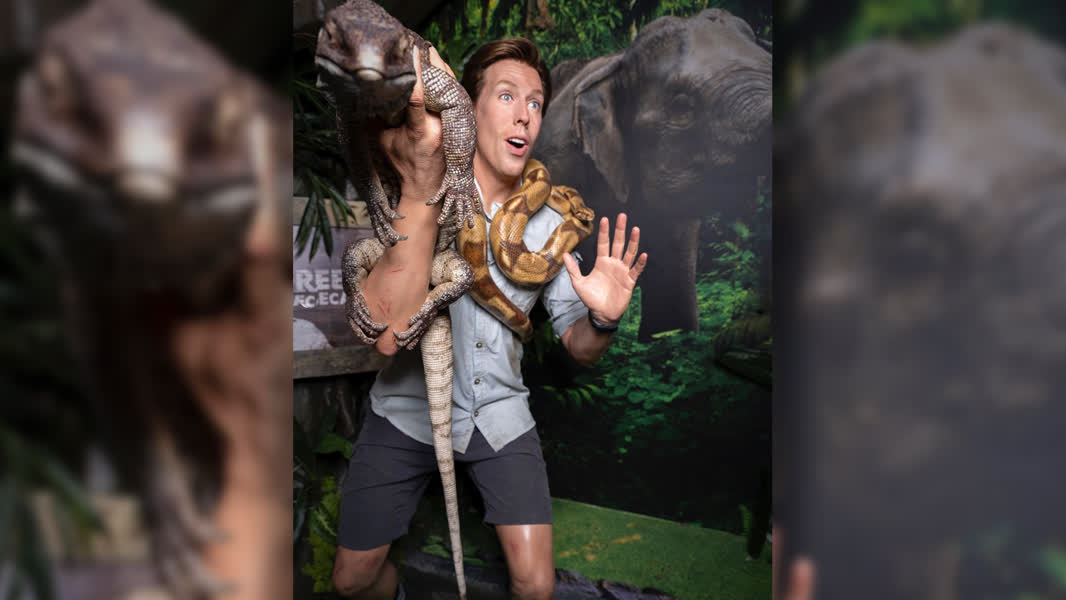 Dat het om Vonk gaat is duidelijk. Op enkele foto’s die hij via sociale media deelt, moet je soms goed kijken wie de echte is. De gigantische, bewegende leguaan op de onderarm van de bioloog is praktisch het enige grote verschil tussen echt en nep.
