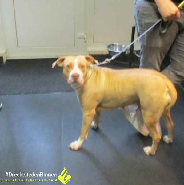 In het Weizigtpark is donderdag 20 juni een teefje vastgebonden aan een boom en daarna verlaten door zijn baas. Het gaat om een Amerikaanse Stafford.