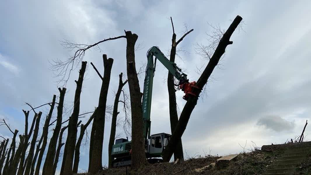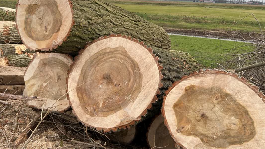 Eén voor één worden de populieren ontmanteld en afgevoerd.