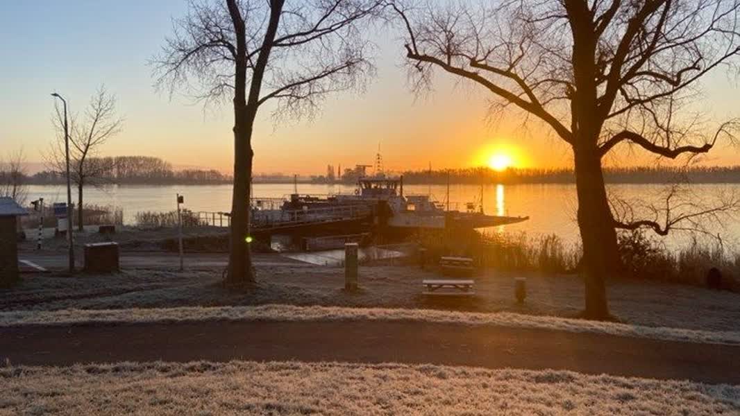 De zon komt op boven de Nieuwe Merwede. De foto is genomen in december op de Zeedijk bij de Kop van het Land, midden ligt het veer Dordrecht-Werkendam.