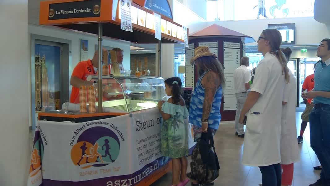 Alleen vandaag kun je in het Albert Schweitzer Ziekenhuis vanwege het warme weer ijs kopen. De opbrengst gaat naar de Roparun waar het ziekenhuis een eigen team heeft die het hele jaar geld inzamelt.