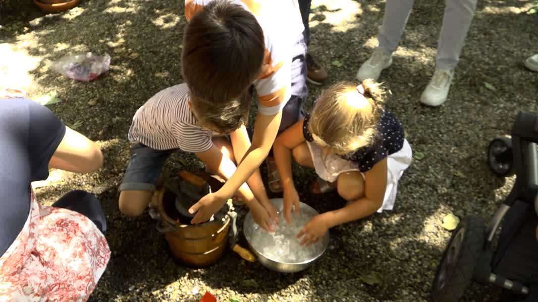 In de tuin van het Huis van Gijn konden kinderen vanmiddag zelf ijs maken zoals dat vroeger gedaan werd. Met een methode uit de negentiende eeuw maakte conservator Wyke Sybesma met behulp van de kinderen de hele middag verschillende smaken schepijs.