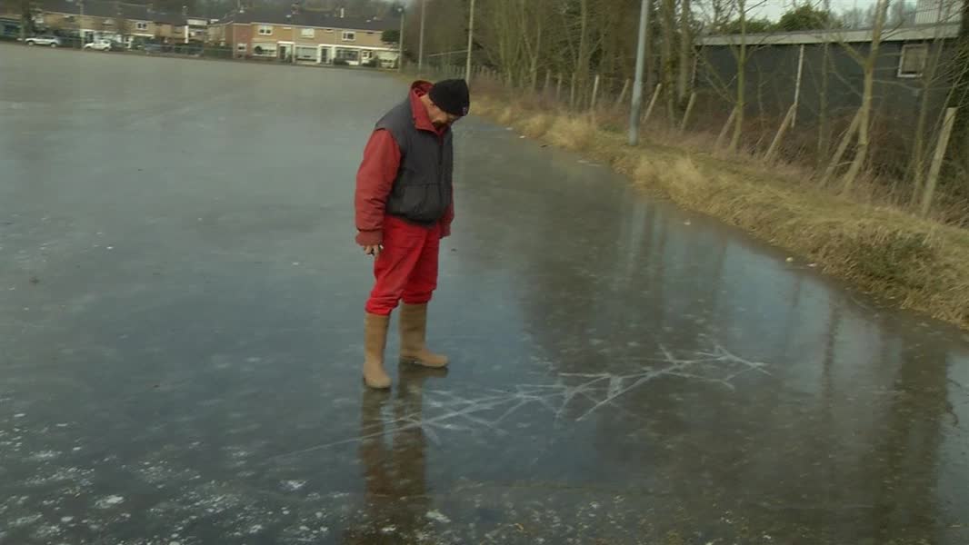 Er is nog iets mis met het ijs. Je ziet er op sommige plekken duidelijk gras inzitten. Dat komt, omdat de ondergrond nu niet vlak genoeg is om goed te kunnen maaien. "We wilden het nu al met een laser vlak maken, maar toen ging het vriezen en hebben we het maar uitgesteld. Komende week, als het ijs is verdwenen en het water weggepompt, gaan we alsnog aan de slag", zegt Blankenstijn. &t=4s