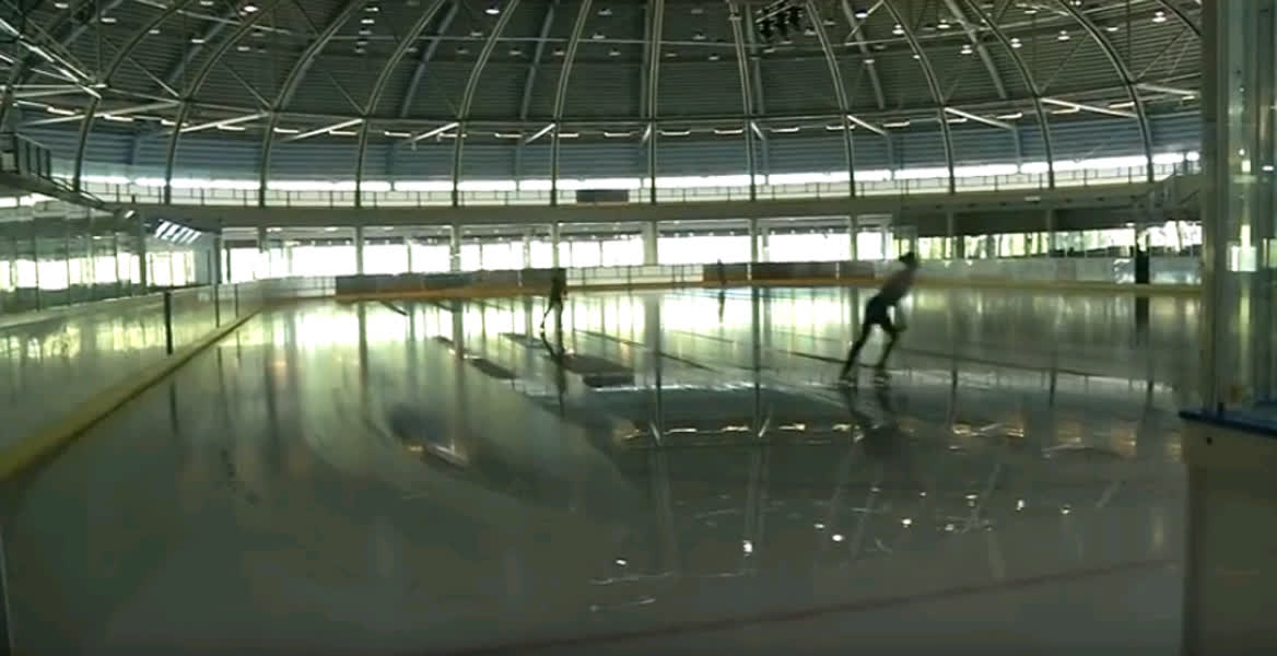Dezer dagen wordt er nieuw ijs op de 250 meterbaan van de ijshal gemaakt. Een flinke klus.