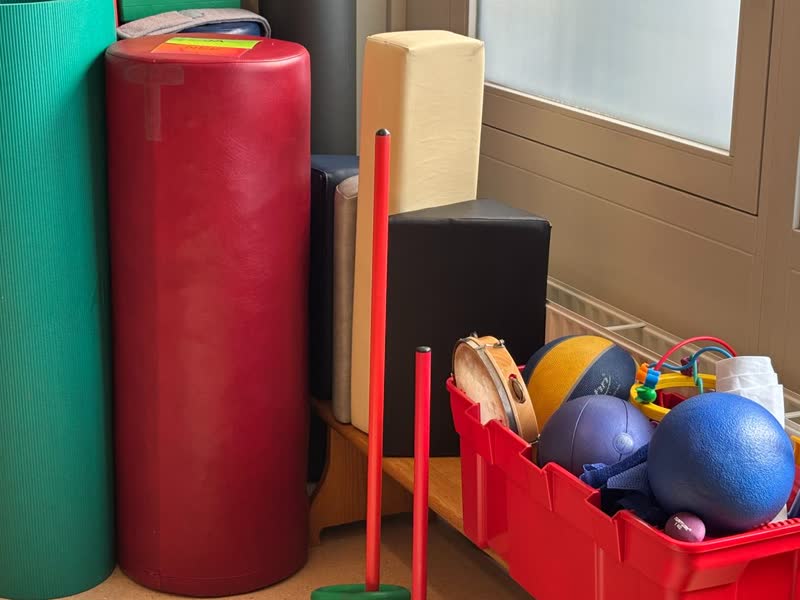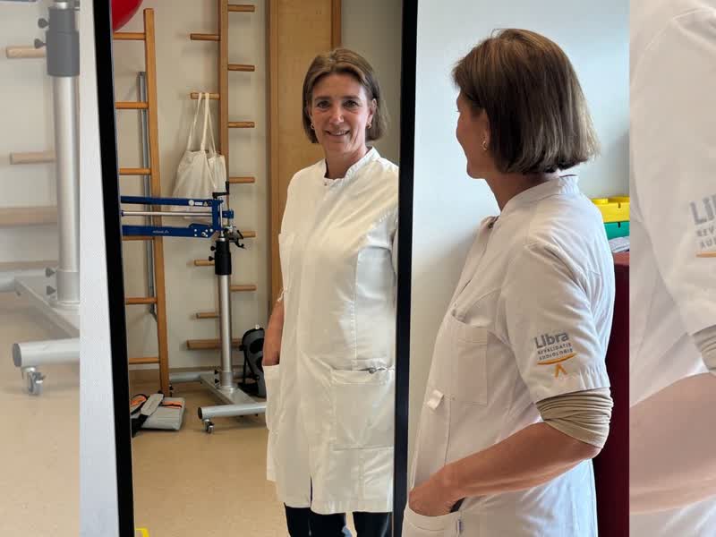 Kim neemt me mee naar een kamer vol ballen, kegels en matten. Er staat een tafel, waarmee een patiënt rechtop kan worden gezet. Er is een soort klimrek en in het midden staat een grote spiegel. Vooral de spiegel fascineert me. “Daar zetten we de mensen in hun rolstoel voor om naar zichzelf te kijken”, vertelt Kim. “Want je eigen spiegelbeeld blijkt van alle dingen het meest verankerd in je brein.”