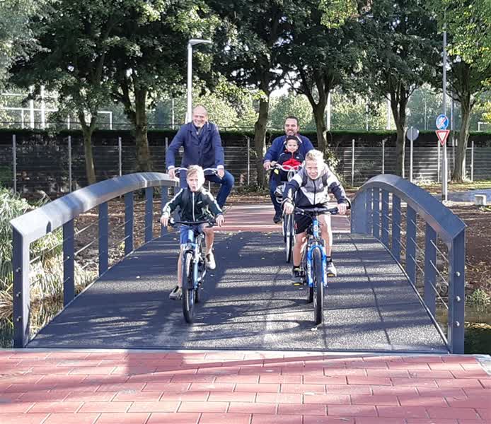 Twee voetballertjes van Oranje Wit hadden woensdag de eer om - samen met wethouder Rik van der Linden - de gloednieuwe fietsbrug te testen. Dankzij deze brug op Sportpark Stadspolders kunnen fietsers nu in één lijn van de Groenezoom naar de fietsenstalling bij Oranje Wit.
