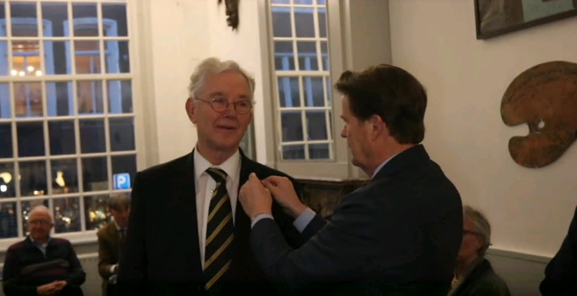 John Reijnders kreeg vrijdagavond in teekengenootschap Pictura de Johan de Witt-speld uitgereikt door Piet Sleeking.