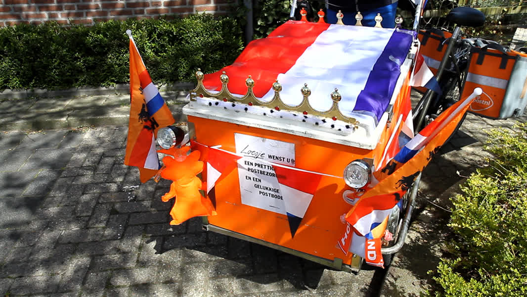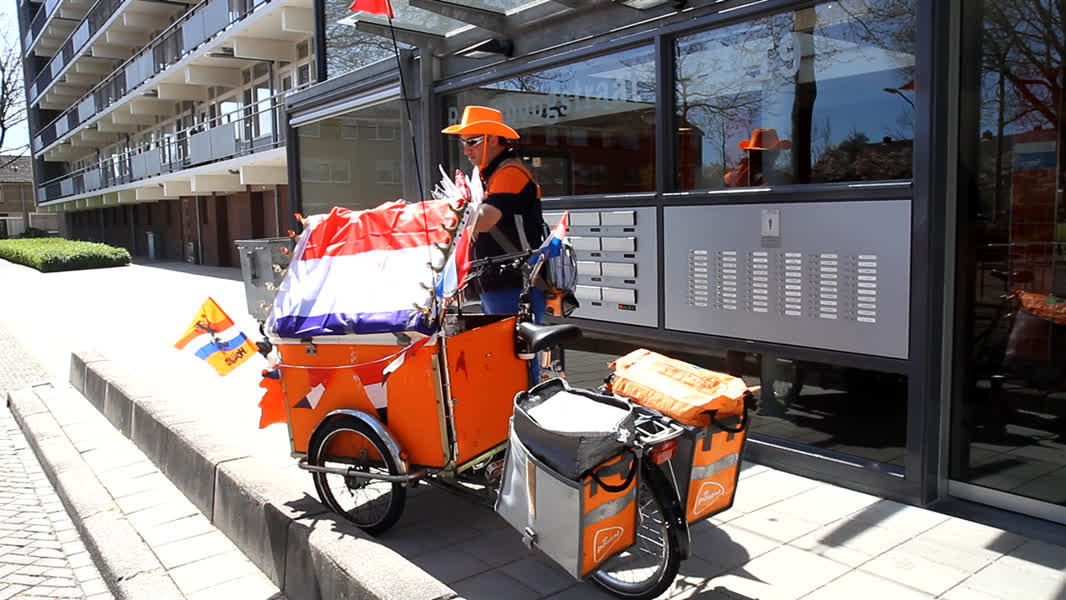 De kleur van zijn bedrijfskleding is al oranje, maar hij heeft zijn bakfiets ook helemaal versierd. John heeft zijn fiets al vaker versierd. Hij brengt de post rond in een deel van Sterrenburg.