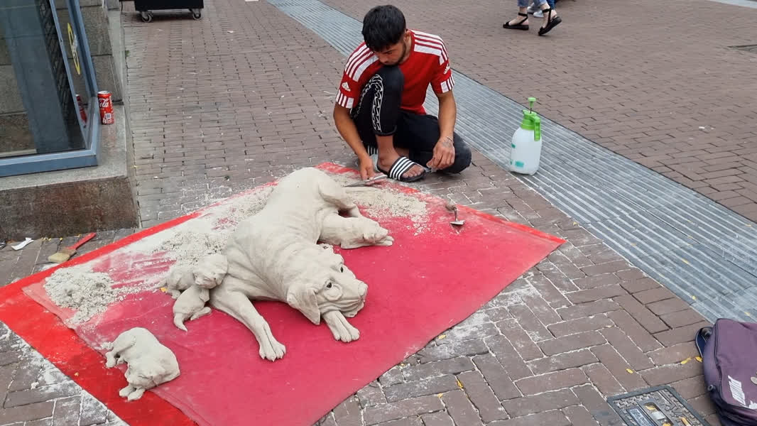Gewapend met een hoop zand en wat water streek de artistieke jongen neer bij het Begijnhof. Van laag per laag toverde Hadi het zand om tot een beeld van een hond met haar puppy’s.