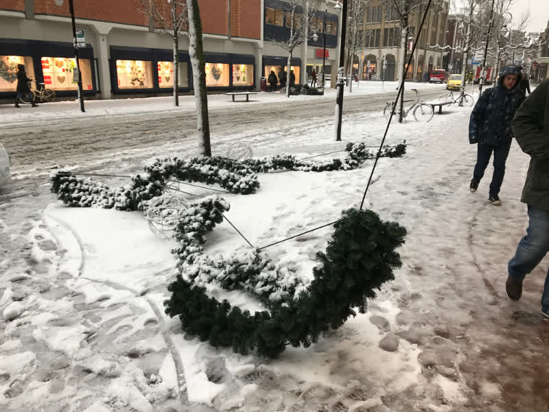 De kerstverlichting in de binnenstad bleek zondagmiddag niet bestand tegen het gewicht van het pak sneeuw dat was gevallen. Om 14.15 uur kwam een van de snoeren op het Bagijnhof naar beneden, waarbij een passerend meisje lichtgewond raakte.