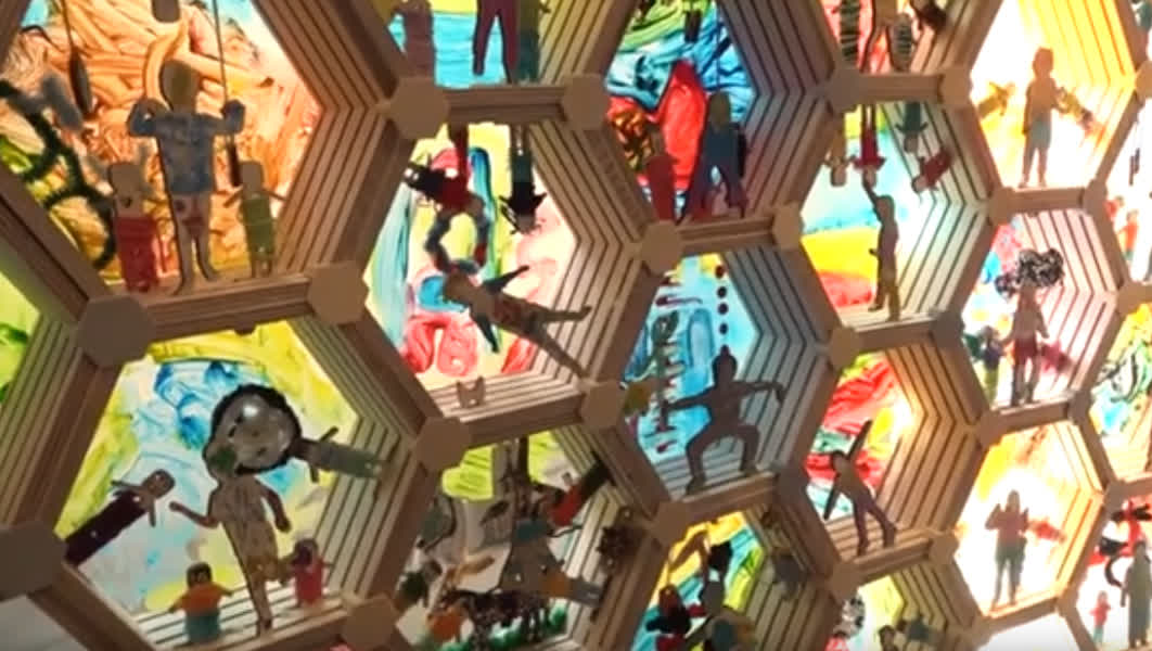 Met zichzelf als middelpunt maakten de kinderen een miniwereld in de zeshoekige kunstwerken. Ze bestaan uit maximaal vijf verschillende lagen, gevuld met dingen die belangrijk zijn voor hun.