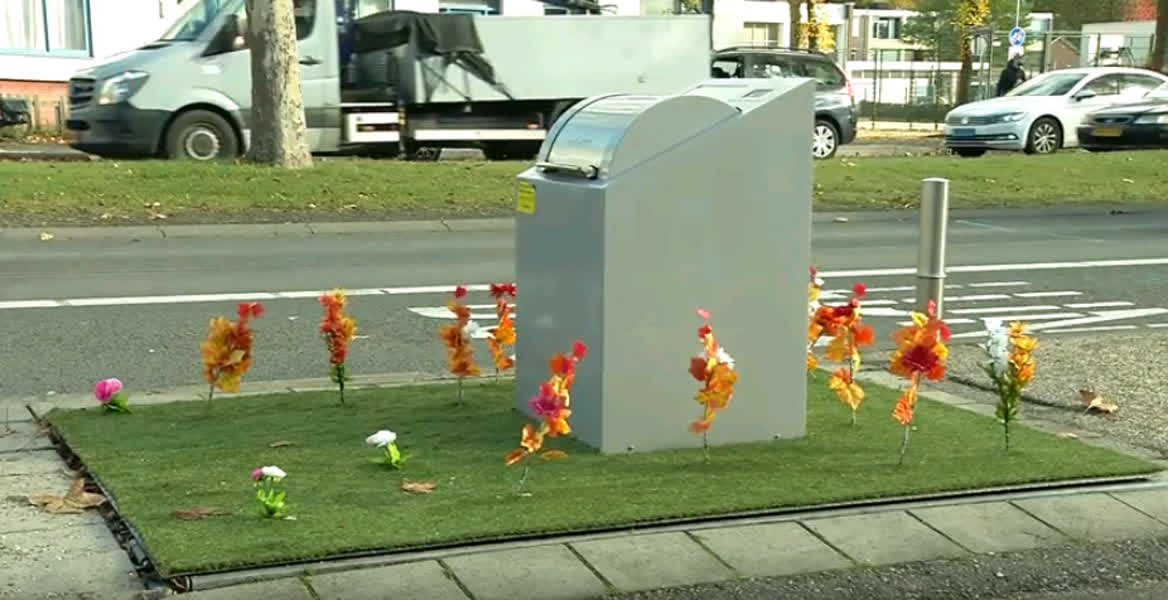 Het lijkt een simpel idee, maar schijnt effectief. Kunstgras en -bloemen rond een ondergrondse container die voorkomen dat er vuilniszakken naast worden gezet.