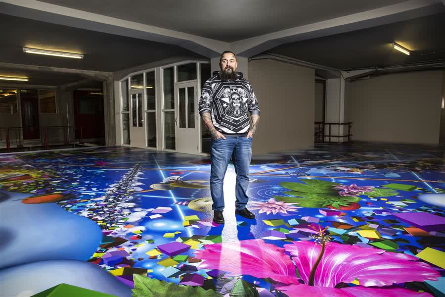 Kunstenaar Arno Coenen legt artistieke vloer van 80.000 pixels in Groot Handelsgebouw