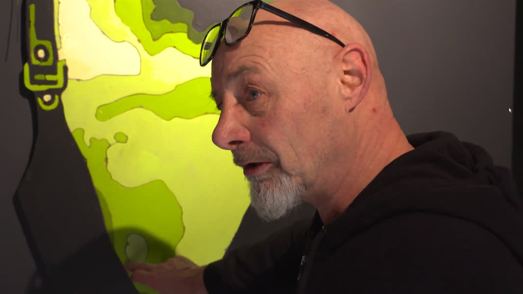 Brouwer schildert niet op een doek, maar maakt houten objecten waarbij hij gaten in het hout brandt. “De randen kan ik er helemaal mee afbranden, net als een laser. Niet dat er veel vuur bij komt, maar het komt door de kracht van het vuur.”