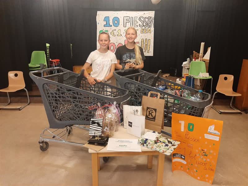 Leerlingen Julia en Maresse geven toe dat dat bedrag misschien wat ambitieus is, maar 1000 euro moet wat hen betreft zeker haalbaar zijn. Iedereen kan tien lege flessen of een euro bij hen inleveren, in ruil voor een lootje. Maresse: “Op 12 juli hebben we een loterij en worden alle prijzen uitgedeeld.”