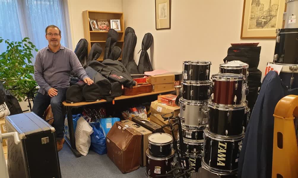 Niet alleen kantoren van bestuursleden zijn bezaaid met trommels, cello's en andere instrumenten, ook het atelier van vioolbouwer Lucienne staat vol. Maar dat is eigenlijk geen doen, vertelt ze. "We knappen de instrumenten kosteloos en in eigen beheer graag op, maar daarna moeten ze wel weer uit mijn atelier verdwijnen anders houd ik geen ruimte over voor mijn werk."