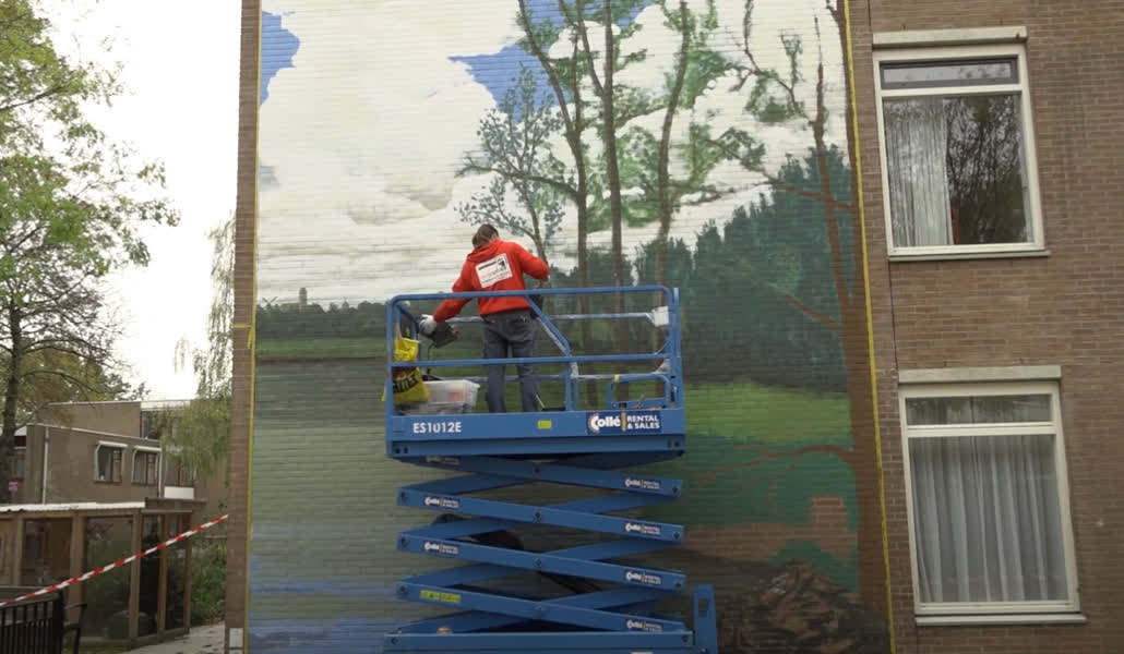 Remco is sinds twee weken bezig met de schildering, en die begint al aardig vorm te krijgen. Het ontwerp heeft hij niet alleen gemaakt, de bewoners van Crabbehoven hebben meegedacht, vertelt hij: “Er is een enquête gehouden om erachter te komen wat zij nou graag op de muur zouden willen, en de uitkomst daarvan paste erg goed bij wat ik graag schilder: De Biesbosch.” Wat Remco betreft hoeft het niet bij een enquête te blijven: “Ik hoop dat er een keer iemand met me mee komt schilderen.”