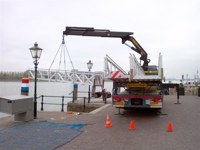 De loopbruggen worden vanochtend geplaatst. Daarmee wordt voorkomen dat het koningspaar uitglijdt op de bestaande gladde stenen trap. Eén loopbrug komt op het Groothoofd. De andere twee zijn bestemd voor de Koninklijke Roei- en Zeilvereniging. Daar moet 16 meter worden overbrugd.