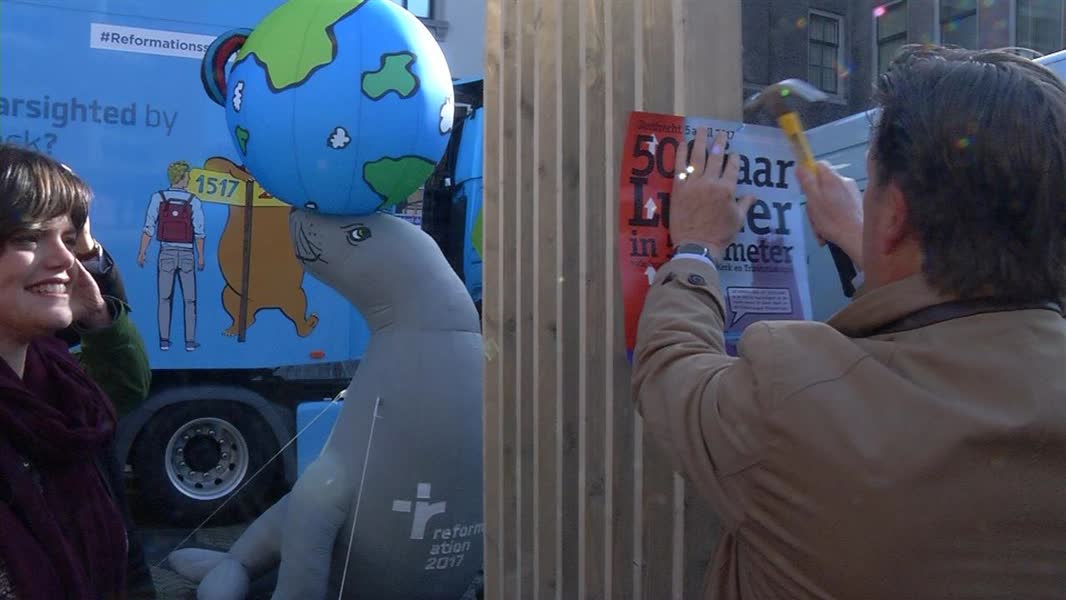 De verhalenbus die ter gelegenheid 500 jaar Luther door Europa toert is vanmorgen geopend door het vastspijkeren van pamfletten door loco-burgemeester Piet Sleeking.
