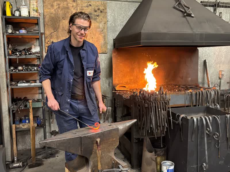 De jonge smid werkt in de smederij in Bleskensgraaf aan allerlei restauratieprojecten. Van hekwerken, bruggen tot kunstwerken. Het liefst maakt hij allerlei mooie vormen. "Ik maak nu bijvoorbeeld een krul, die je veel terugziet in oude gesmede hekwerken over de hele wereld."
