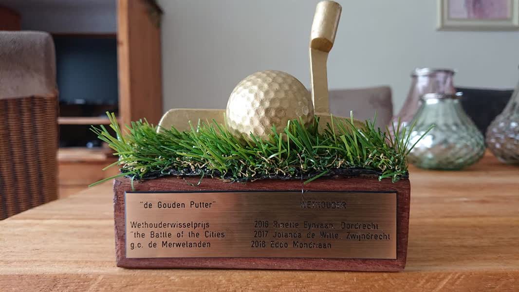 Sportwethouder Marco Stam heeft woensdagmorgen zelf een sporttrofee in de wacht gesleept. Hij won de putprijs voor wethouders tijdens de 'Battle of the Cities' bij golfclub De Merwelanden.