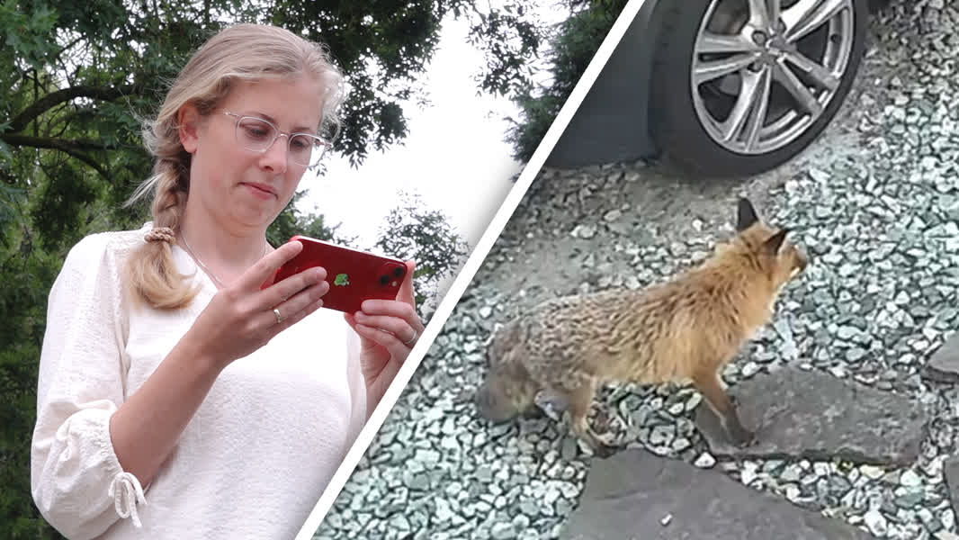 Parmantig loopt het dier over het paadje richting de voordeur, maar voordat hij kan aanbellen neemt de vos een afslag en verdwijnt in de bosjes. Het is allemaal te zien op een bewakingscamera die laat zien hoe ongestoord de vos zich begeeft tussen de huizen. Even verderop is een dag eerder vermoedelijk hetzelfde dier gespot.