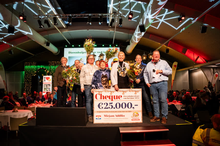 Tijdens het landelijk congres Dierenhulpverlening in Gorinchem kreeg Mirjam Addiks de titel 'Dierenhulpverlener van het jaar' en een cheque met een aardig bedrag uitgereikt en daar is zij erg trots op. “Ik vind het een hele mooie erkenning en waardering voor het werk wat we mogen doen. Want zoals ik altijd heb gezegd, je doet het niet alleen. Ik heb een team van 130 vrijwilligers achter me staan met ieder een eigen taak.”