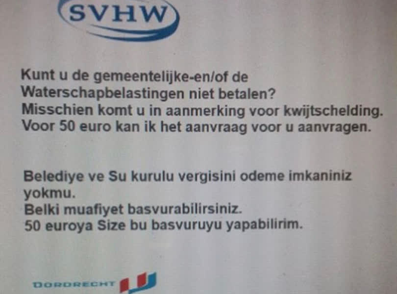 De zogenaamde medewerker van een advocatenbureau in Dordrecht deed een oproep aan mensen die de gemeentelijke belastingen niet kunnen betalen.