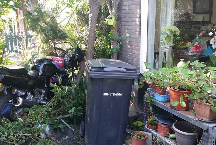 Op de M.H. Trompweg is zondag een motorrijder de voortuin van een woning binnengereden.