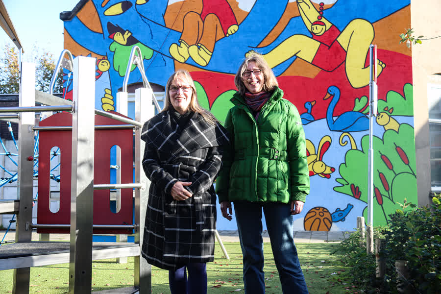 De Vries-Lentsch, die ook illustrator, grafisch ontwerper en docent is, liet zich voor het kunstwerk inspireren tijdens gesprekken met buurtbewoners. Kolk: “Daarnaast hebben kinderen uit Krispijn een workshop bij Freek gevolgd, waarbij ze hele mooie schilderijen hebben gemaakt.” De creaties van de kinderen worden vereeuwigd in bijna vijfendertig stoeptegels.