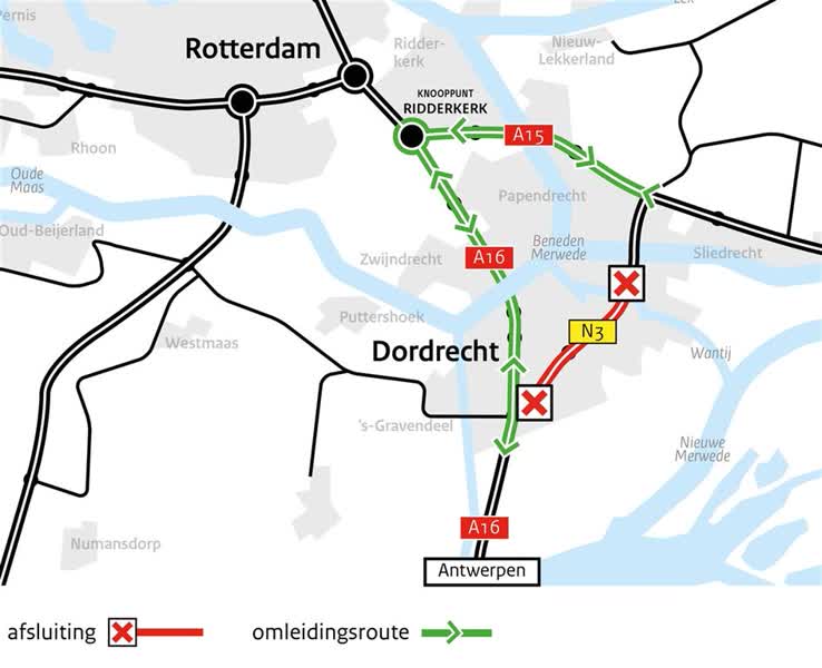 Volgende week start de laatste fase van het groot onderhoud van de N3. Vanaf vrijdag 18 juni 22.00 uur tot maandag 21 juni 05.00 uur is de N3 in beide richtingen afgesloten tussen de Merwedestraat in Dordrecht en de A16.