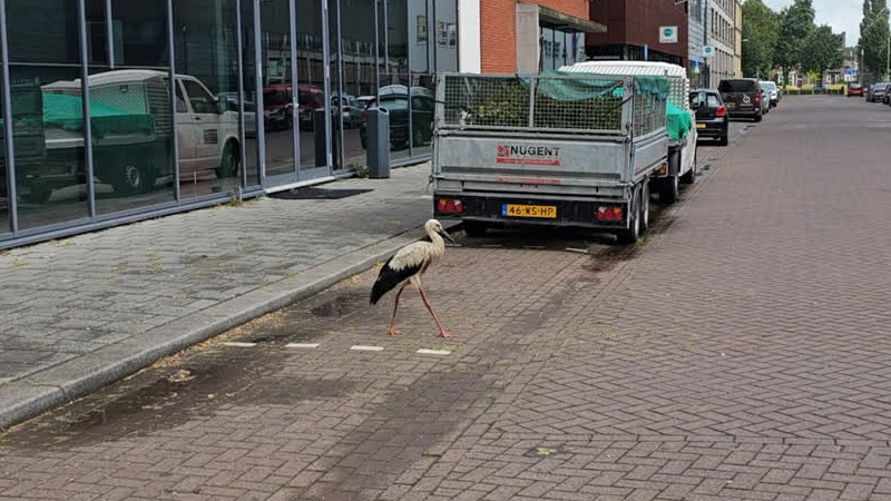 Een jonge ooievaar liep donderdagmiddag 3 augustus verdwaasd rond bij het Leerpark. De jonge vogel, ...
