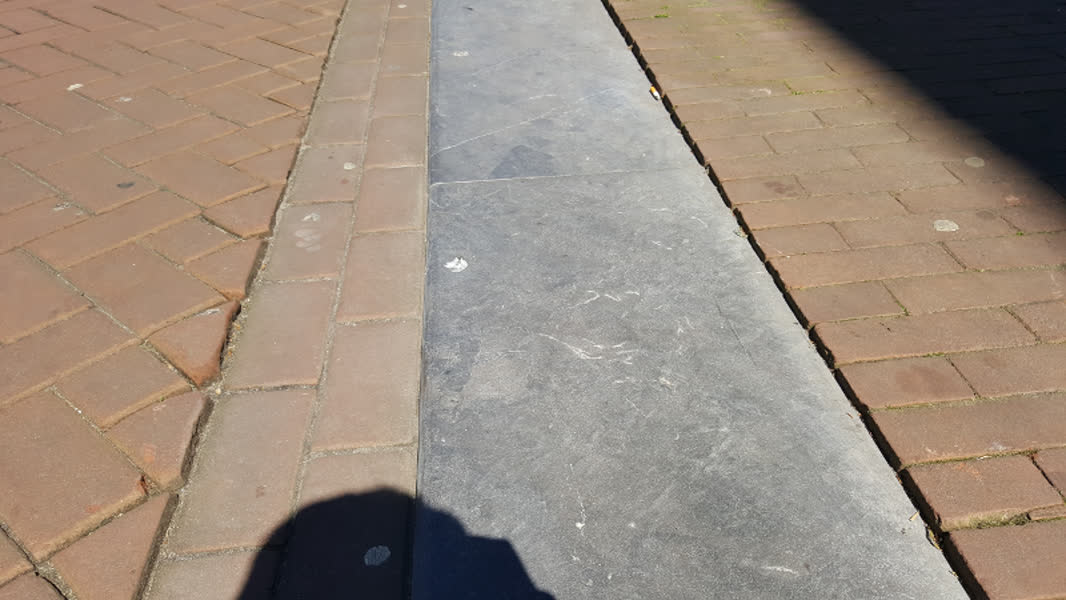 In de binnenstad van Dordrecht liggen op een aantal plaatsen repen natuursteen in de bestrating. Mooi, maar gevaarlijk glad.