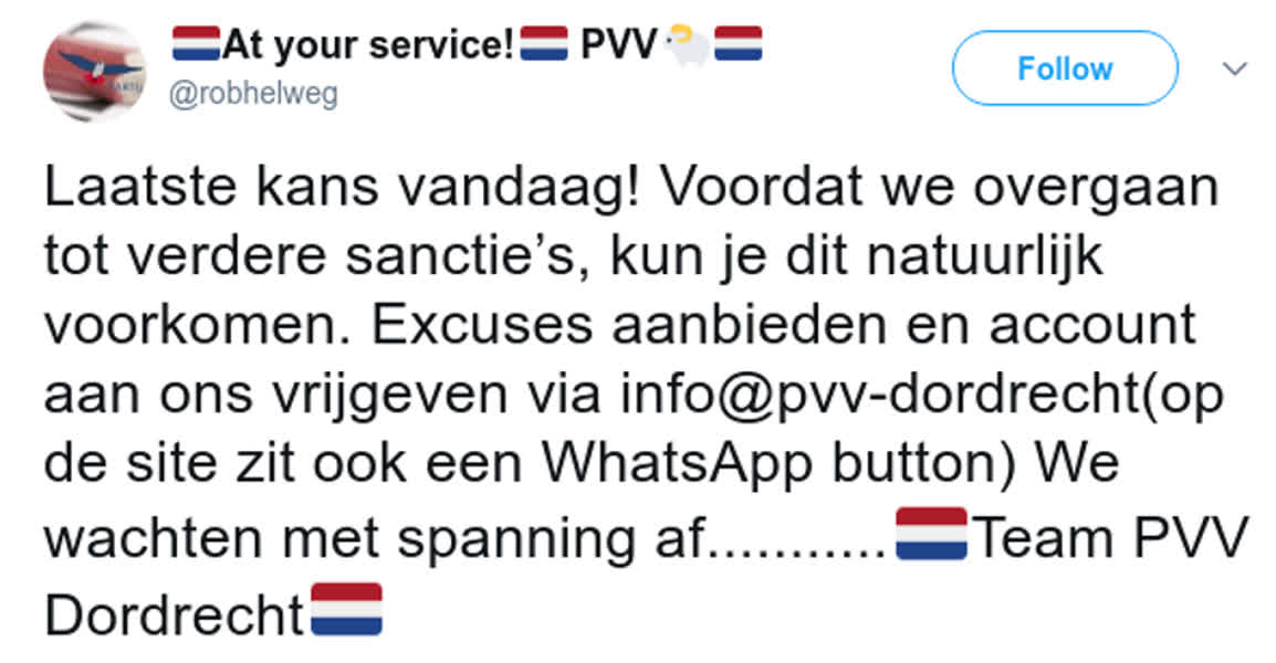 De afdeling Dordrecht van de PVV heeft de eigenaar van een nep-account dat zich voordeed als officiëel PVV-account nog een kans gegeven om zijn leven te beteren.