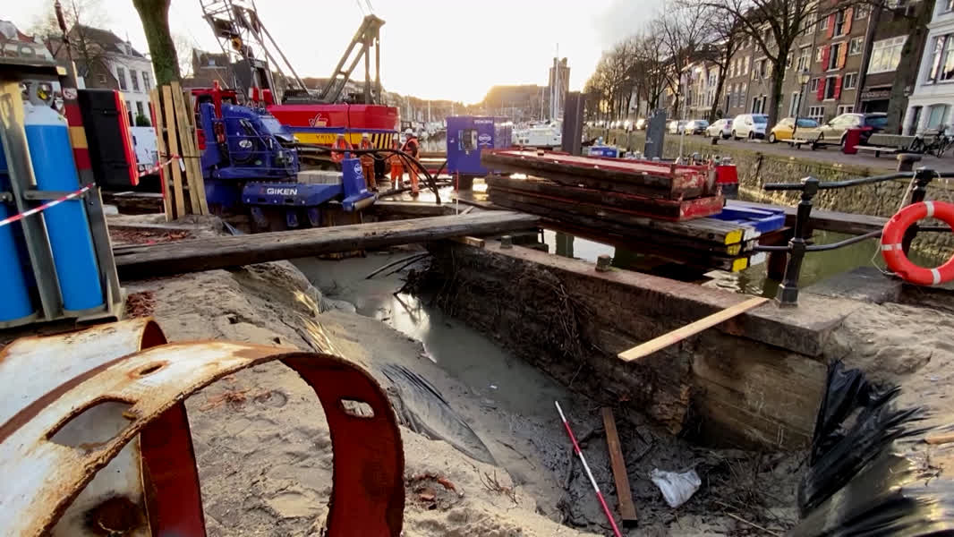 Kijk hieronder naar een reportage over het herstel van de kade aan de Aardappelmarkt.