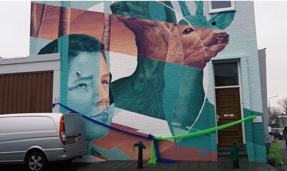 Een jongen en twee reeën komen deze dagen tot leven op de muurschildering op het Sociaal Plein in wo...