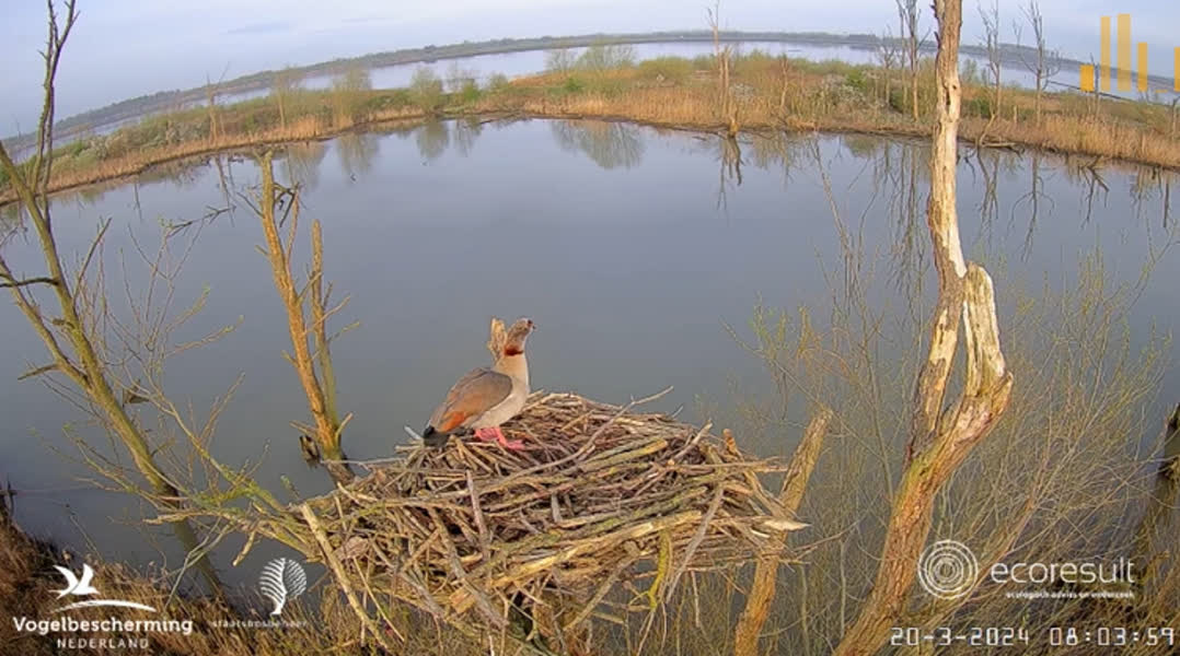 Vooralsnog wordt het nest vooral bekeken door andere dieren. Een kraai, twee Canadese ganzen en een paar Nijlganzen zijn geland. Soms op een nogal onhandige manier, zo is te zien op