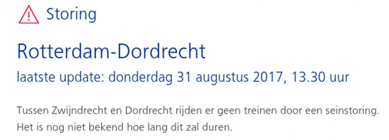 Nu de seinstoring van vanochtend gelukkig is opgelost, is het tijd voor de middageditie.Vanaf 13.30 uur is het treinverkeer tussen Dordrecht en Zwijndrecht weer stilgelegd en het is niet bekend wanneer deze storing voorbij is.