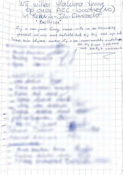 De handtekeningenactie van de asielzoekers op de boot is ondertekend door 120 mensen en leest als volgt: “Wij willen Hakima terug op onze AZC-locatie in Hendrik-Ido-Ambacht. Zij heeft zich een jaar lang vol voor ons en de mensen hier ingezet. Ons was beloofd dat zij op het schip kon blijven werken, nu is ze onverwachts ontslagen en wij eisen openheid en een eerlijk onderzoek.”