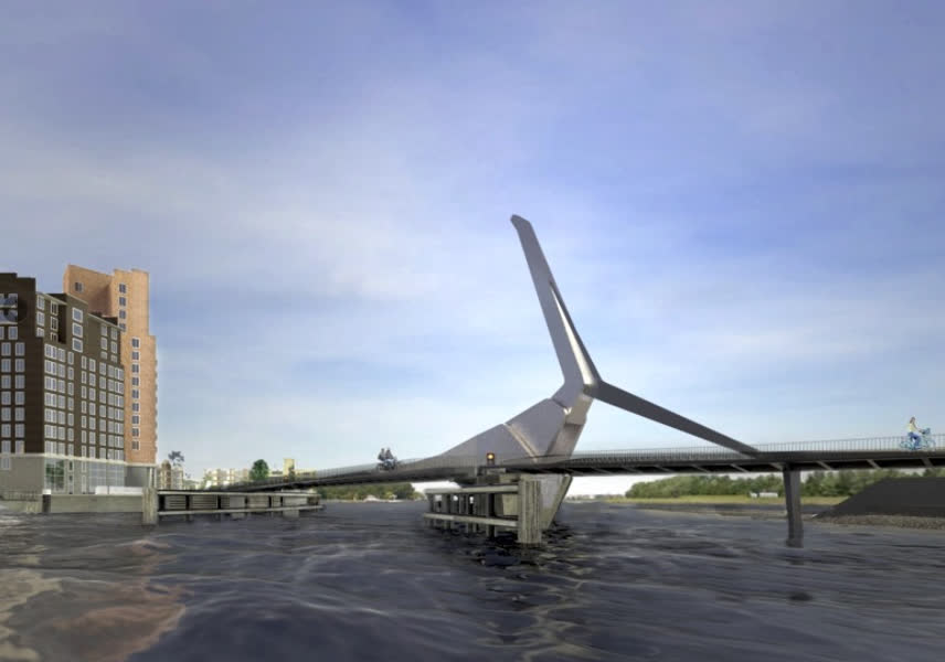 De nieuwe Prins Clausbrug tussen Stadswerven en de Merwekade krijgt een 30 meter hoge mast die bij opening eerst naar voren beweegt en daarna naar achteren kantelt.