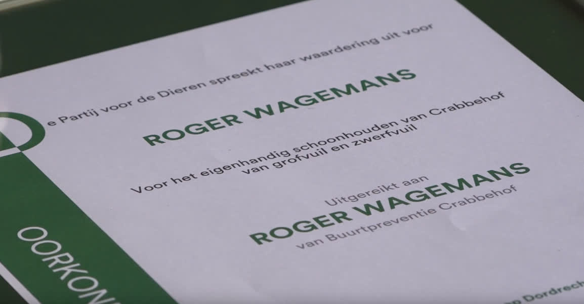 Roger Wagemans heeft vrijdagochtend een oorkonde ontvangen van de werkgroep van de Partij voor de Dieren. Dit omdat hij zich al een jaar lang inzet om Crabbehof schoon te houden.
