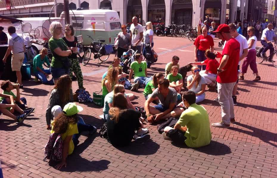 Deelnemers zitten te rusten na een middag WK Verstoppertje spelen in de Dordtse binnenstad.