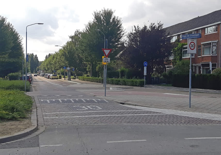 Het wegdek van de Hugo de Grootlaan en het fietspad ernaast wordt vervangen. Beide zijn in slechte staat door spoorvorming en teveel ruimte tussen de klinkers van de rijweg en de tegels van het fietspad.