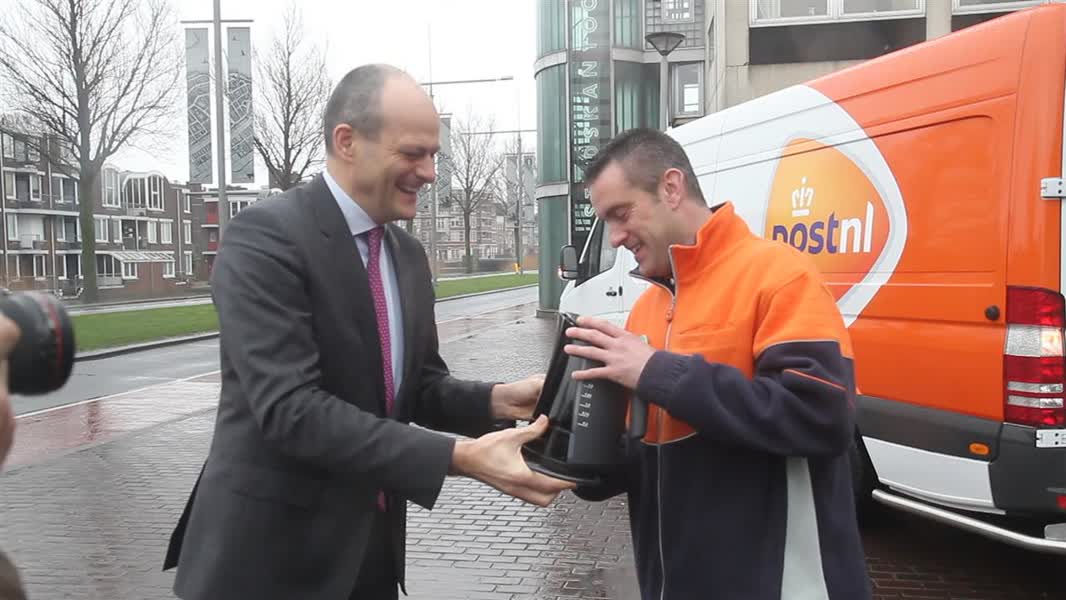 Foto: wethouder Rik van der Linden geeft waterkoker aan pakketbezorger PostNL